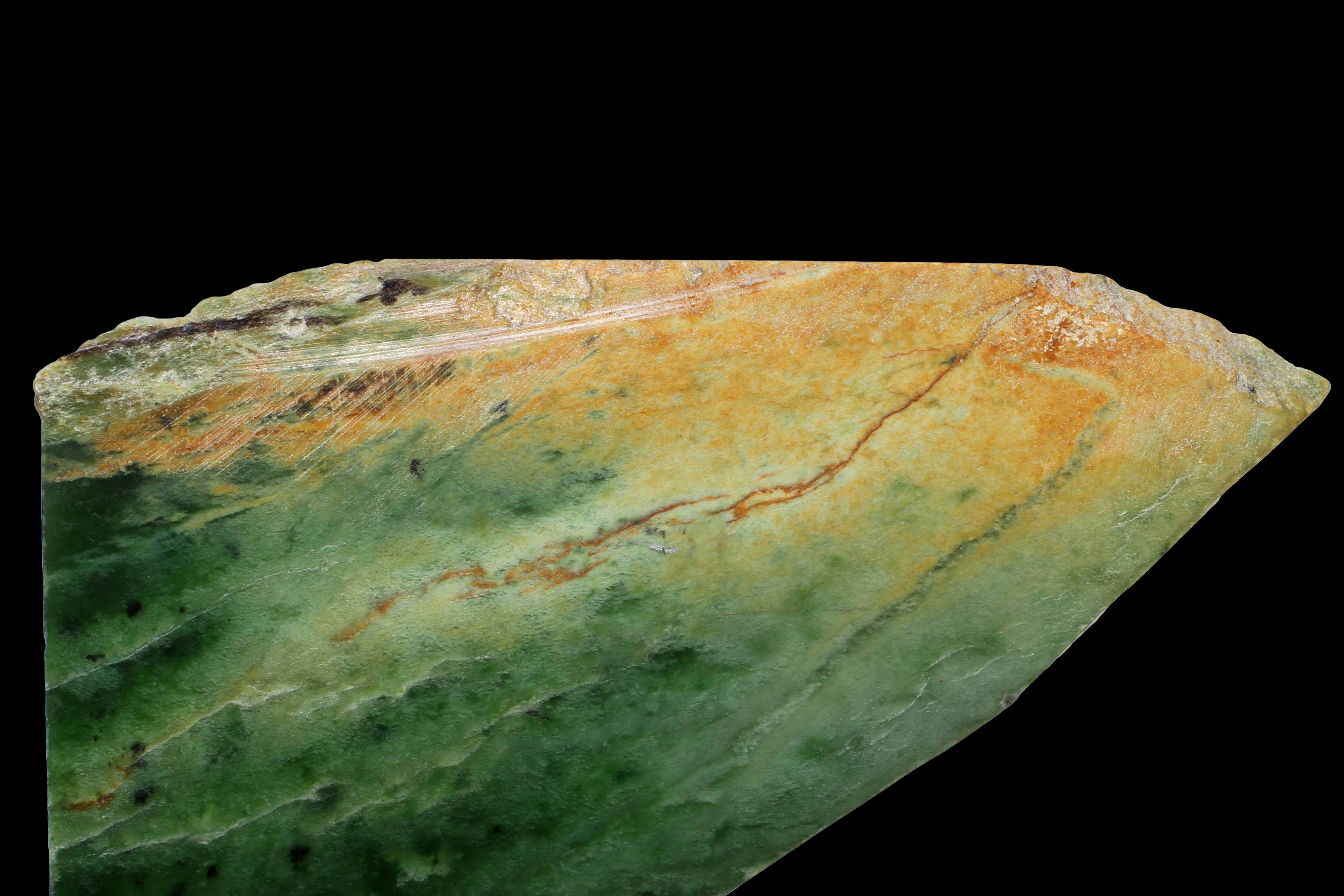 With striking yellow and orange shades that blend into vibrant olive greens like the leaves of the native tree, after which it gets its name, Raukaraka (pictured above) is a beautiful and rare type of pounamu.